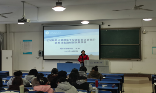 11月8日下午,pp电子游戏平台网站副教授郭云老师在锦绣校区逸夫楼A602教室举行了主题为“区域联动协同视角下安徽自贸区合肥片区科技金融创新发展研究”的学术报告,2020级国际经济与贸易专业的学生到场聆听了报告。