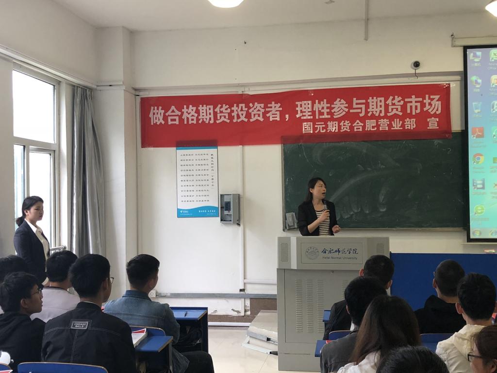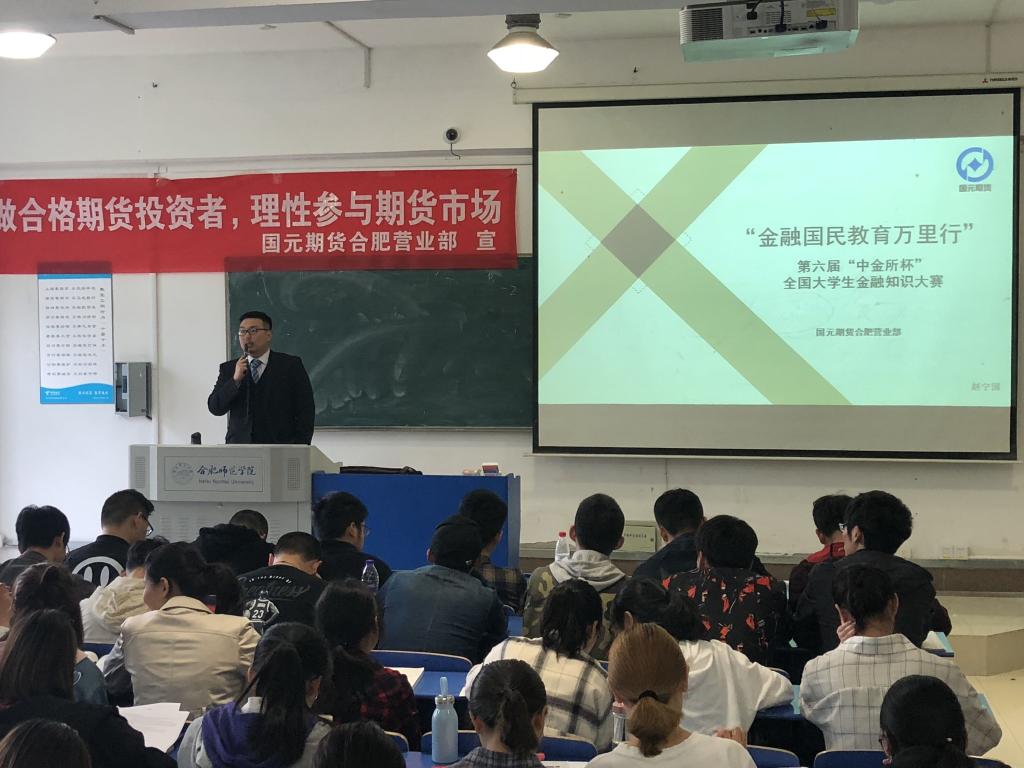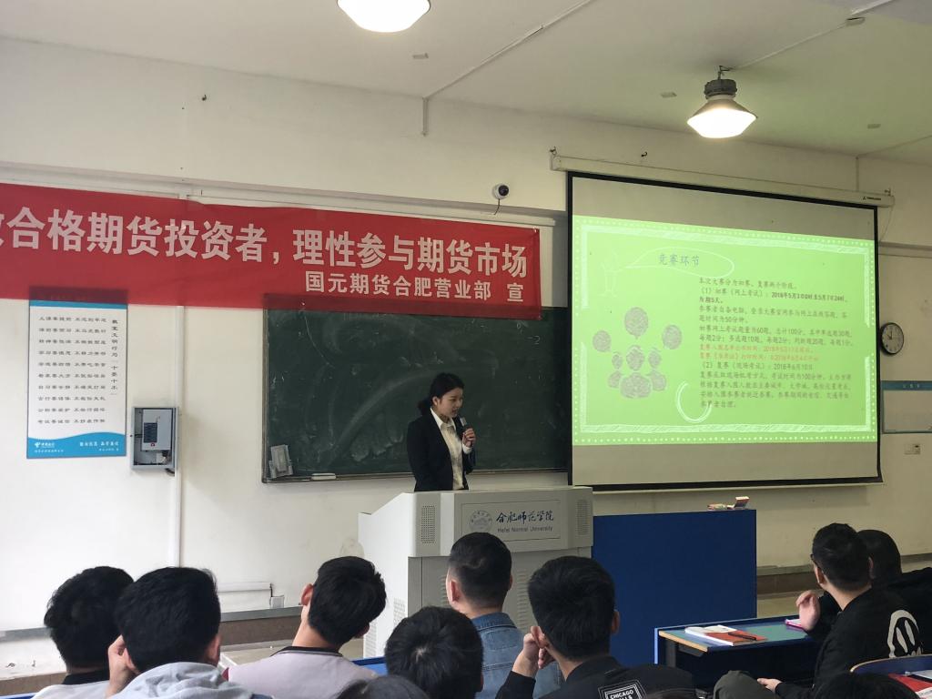 会议过程中,国元期货合肥营业部资深投资经理徐孝艳对中金所高校活动及国元期货情况作了详细的介绍,徐孝艳指出“中金所杯”金融知识大赛目前有1120余所中外高校参赛,15万多莘莘学子报名,114所高校将大赛与评奖评优、保研加分挂钩,200多家金融机构接收获奖学生实习就业等。国元期货合肥营业部资深培训师赵宁国就金融期货及衍生品基础知识作了详细的阐述并与同学们积极互动,通过小游戏等方式激励同学们踊跃抢答。