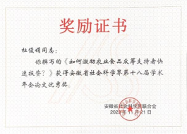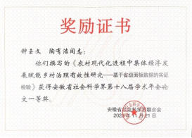 近年来,经管学院高度重视科研团队培育。此次年会征文,学院通过组织科研团队,共动员投稿十多篇,其中钟玉文和科研处陶有浩合作的论文《农村现代化进程中集体经济发展赋能乡村治理有效性研究——基于省级面板数据的实证检验》、丁红梅、黄虹、杨晨合作撰写的论文《安徽省旅游-金融-乡村振兴耦合协调发展研究》分别获得一等奖;杜俊娟撰写的《如何激励农业食品众筹支持者快速投资?》获得优秀奖。(pp电子游戏平台网站:钟玉文)
