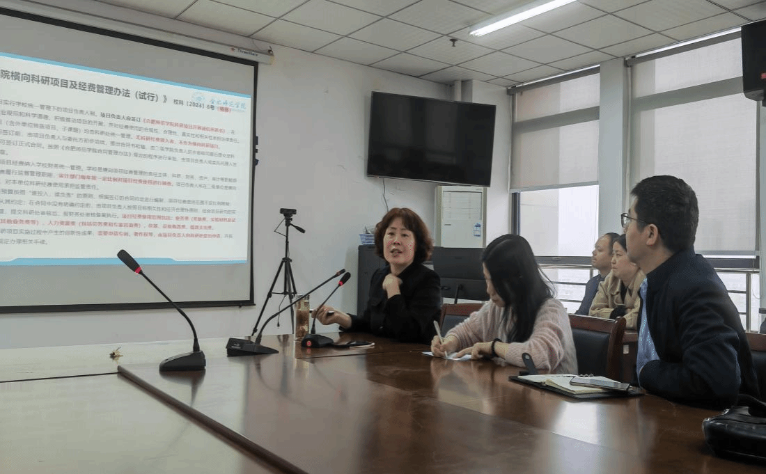 胡昂首先对学校科研管理的主要规章制度进行了解读,并结合实际案例对《合肥师范学院预防与处理学术不端行为实施细则》《合肥师范学院科研促进教学实施办法》等文件中需注意的问题进行了剖析;结合科研管理项目、成果、奖项“三件套”理念,提出了纵向项目、横向项目一体双翼、齐头并进的发展思路;围绕学院科研氛围的营造,对各级各类科研项目申报进行了重点辅导;最后系统介绍了2024年度学校的科研工作计划。