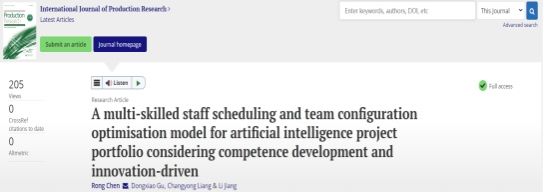 人力资源管理系教授陈蓉在SCI TOP期刊《International Journal Of Production Research》发表论文“A multi-skilled staff scheduling and team configuration optimisation model for artificial intelligence project portfolio considering competence development and innovation-driven”,该期刊位列中国科学院2区,JCR分区Q1。陈蓉教授为第一作者兼通讯作者,合肥师范学院pp电子游戏平台网站为第一署名单位。
