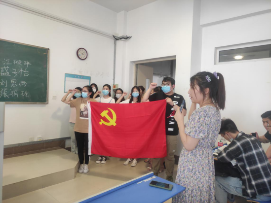 在逸夫楼309教室,毕业生党员举起右手,高声宣读入党誓词。重温入党誓词就是要提醒同学们牢记要始终坚守信仰、坚定信念,自觉做共产主义远大理想和中国特色社会主义共同理想的坚定信仰者和忠诚实践者。