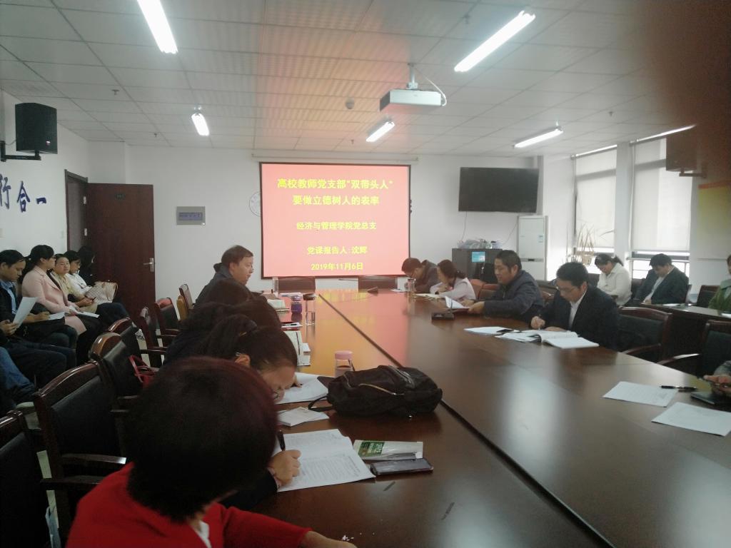 11月6日下午,经管学院在902会议室召开全体党员大会,党总支书记沈辉讲授了题为:高校教师党支部“双带头人”要做立德树人的表率的专题党课。
