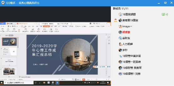 活动经过心理委员个人申请、辅导员审核、线上PPT工作汇报评比环节进行选拔。每位心理委员分别从个人基本能力、工作态度、工作表现、工作提升展望四个方面进行汇报,总结了一年来班级心理健康教育工作。经过激烈的角逐,现授予以下同学“优秀心理委员”荣誉称号。