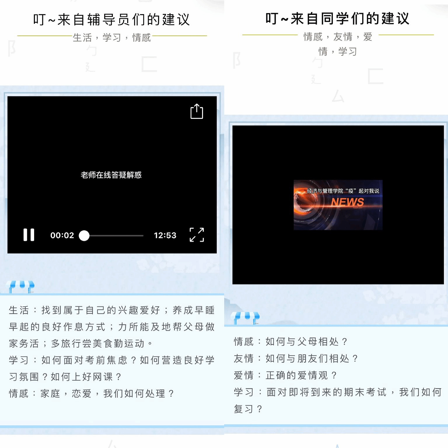 本期活动旨在通过学生和辅导员两个角度进行解答疑惑,帮助学生疏通心理。大家针对上一期同学们拍摄的情景剧中所展示的问题,辅导员和同学们分别录制视频给出他们建议,同学们通过此次活动收益良多。至此,本次心理健康节三期活动已圆满结束。第一期同学们分享故事,第二期用情景剧展现故事,第三期答疑解惑。每一期都在用不同的形式向大家传递心理健康的重要性。