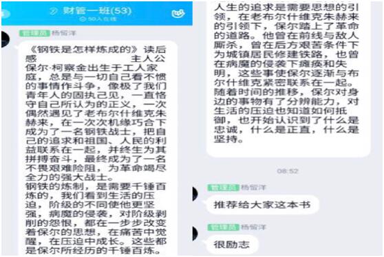 班长蒋大鹏同学和班级同学分享了读《如何阅读一本书》的所思所想,就阅读的层次问题与大家展开讨论。学习委员徐亚柠同学向大家推荐了小说《双城记》,通过他生动地介绍,让不少同学对此书产生了兴趣。随后同学们又讨论了名著《钢铁是怎样练成的》,书中的主人公保尔·柯察金凭借着对生活的无限热情,对理想的无限憧憬,对困难的无限恒心,向我们展示了钢铁就是这样炼成的。