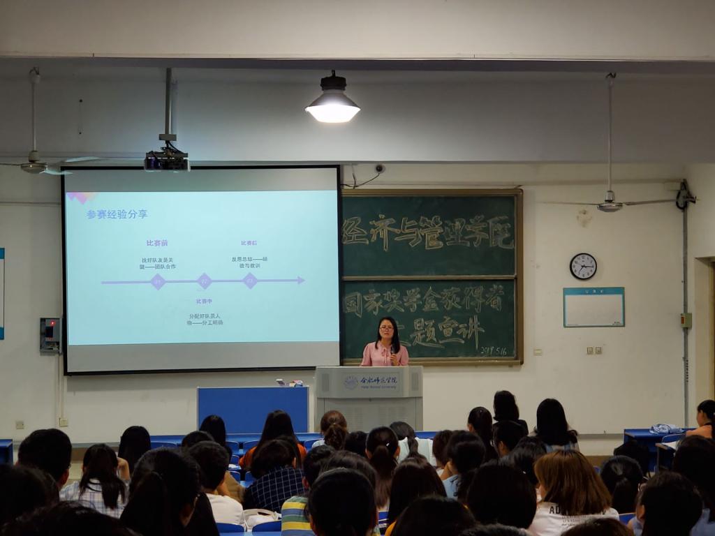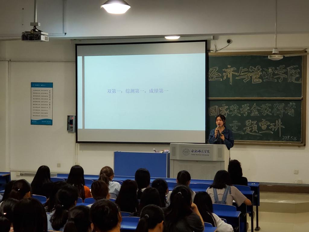 5月16日晚7点,pp电子游戏平台网站在逸夫楼A301教室举行“出彩合师”——pp电子游戏平台网站2018年“国家奖学金”获得者宣讲活动。来自2015级财务管理专业的卢敏同学、2016级经济学专业的胡悦同学为pp电子同学作报告。院党总支副书记陶敏及学院2018级部分专业同学参加了此次宣讲会。宣讲会由辅导员谷跃东老师主持。