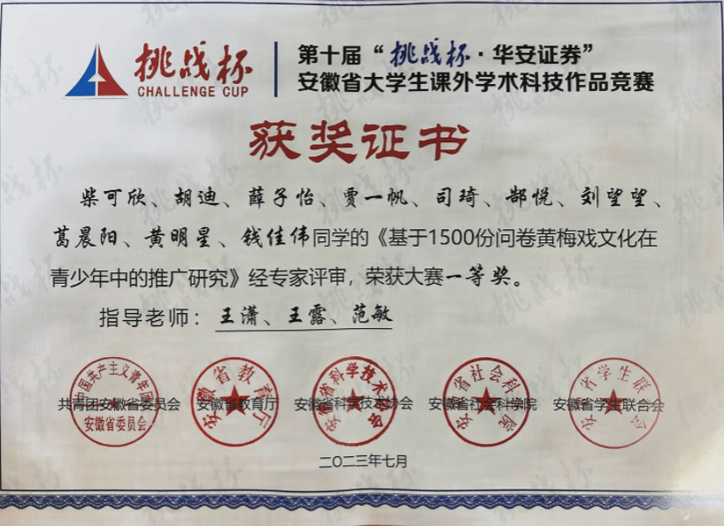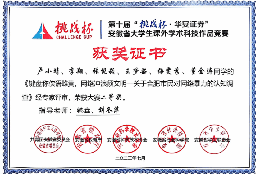 经过公开展示、答辩等环节激烈角逐,pp电子游戏平台网站柴可欣、胡迪、薛子怡、贾一帆、司琦、郜悦、刘望望、葛晨阳、黄明星、钱佳伟同学的《基于1500份问卷黄梅戏文化在青少年中的推广研究》(哲学社会科学类调查报告,指导教师为王潇、王露、范敏),获省赛一等奖;pp电子游戏平台网站卢小晴、李翔、张悦颍、王梦茹、梅雯秀、董金涛同学的《键盘称侠语雌黄,网络冲浪须文明—关于合肥市民对网络暴力的认知调查》(哲学社会科学类调查报告,指导教师为姚垚、刘冬萍),获省赛二等奖。