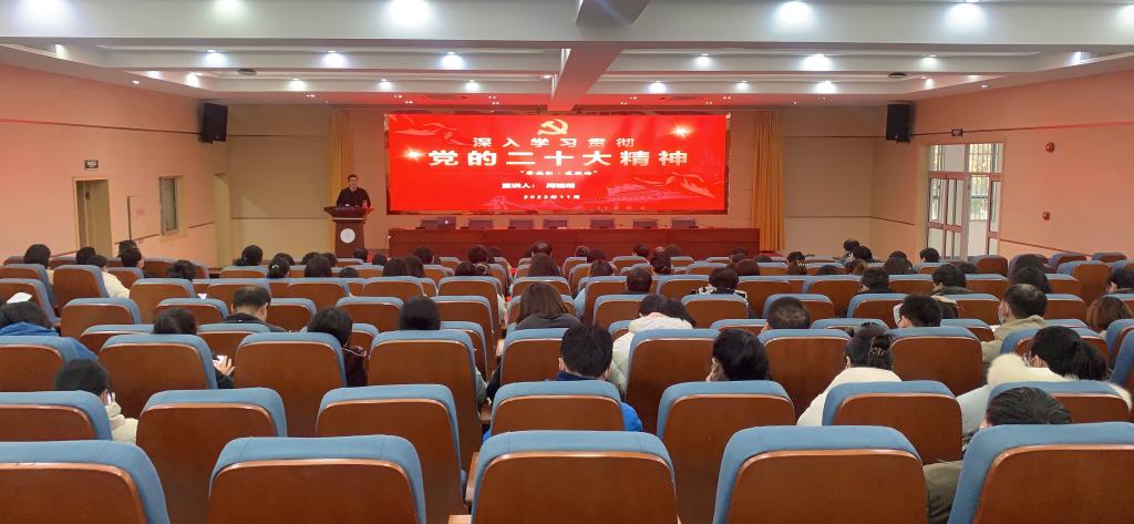 本网讯 为深入学习贯彻落实党的二十大精神,确保党的二十大精神入脑入心、落地落实,12月7日下午,在锦绣校区学术报告厅,院党委委员、副院长周端明深入师生作党的二十大精神宣讲。pp电子游戏平台网站、数学与统计学院全体教职工、教务处教工党支部以及部分学生党员代表现场聆听了宣讲报告。pp电子游戏平台网站党委书记沈辉主持报告会。