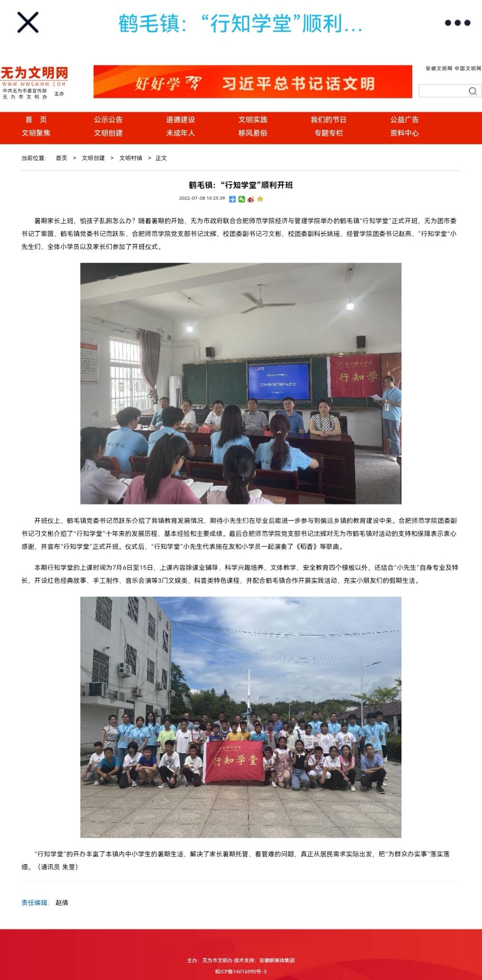 本网讯 今年暑期,在做好疫情防控的前提下,本着“爱满天下,知行合一”的宗旨理念,我校大学生深入安徽省各地开办行知学堂实践活动,通过丰富精彩的课堂活动为各地小朋友们充实暑期生活,也为家长们解决暑期看管难的问题。安徽省无为市本土媒体《无为市文明网》对无为“行知学堂”顺利开展情况进行了拍摄报道,于7月8日上午10时25分在《无为市文明网》上发布了报道内容。(pp电子游戏平台网站 何梦媛)