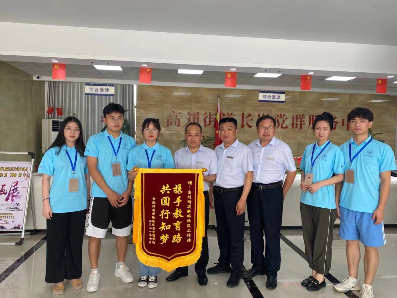课程结束后,为感谢高刘街道新桥社区工作站对于本次行知学堂的大力支持与帮助,小先生们代表合肥师范学院pp电子游戏平台网站,向社区工作站赠送了题为“携手教育路,共圆行知梦”的锦旗,社区工作人员热情接待了小先生们,并与小先生们留下了珍贵的合影。