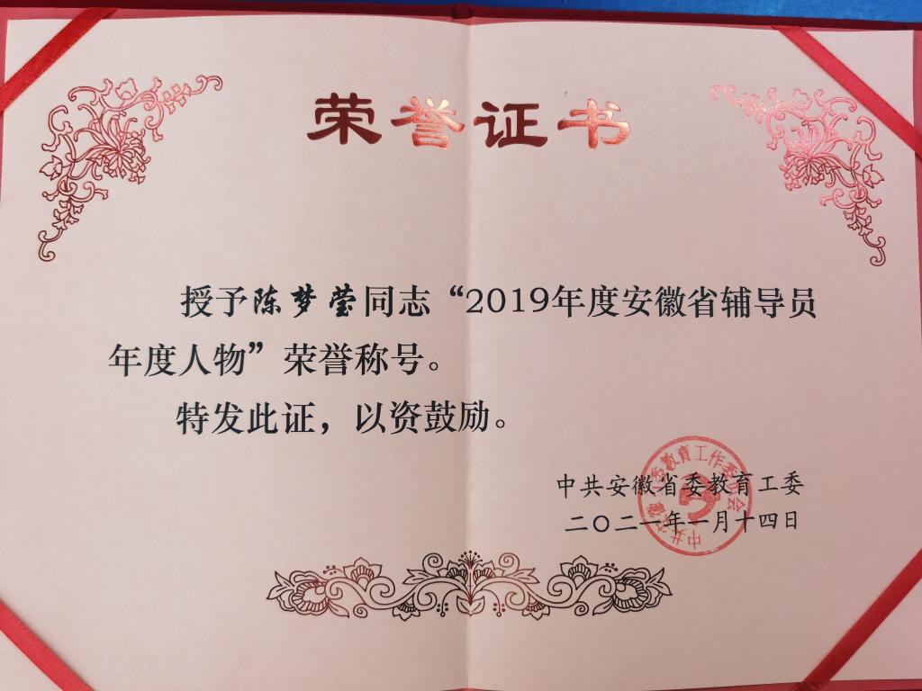 近日,安徽省委教育工委下发《中共安徽省委教育工委关于公布2019年度全省高校辅导员年度人物和优秀辅导员评选结果及2019年度安徽省大学生年度人物评选结果的通知》(皖教工委函〔2021〕13号),pp电子辅导员陈梦莹获得“2019年度全省高校辅导员年度人物”荣誉称号。