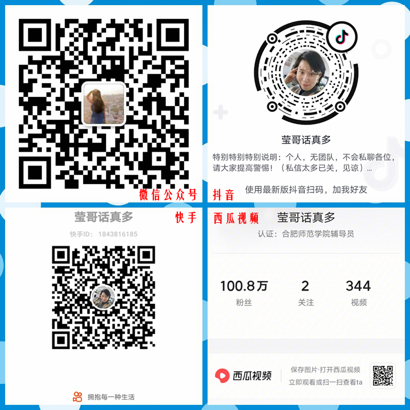 “莹哥话真多”同名微信公众号,2013年建立,2017年改版发表原创文章782篇,累计字数270万字,被各类公众平台转载124篇,其中官方公众号“中国青年报”转载4篇,教育部中国大学生在线的“高校辅导员在线”公众号转载8篇,“高校辅导员联盟”转载82篇,“辅导员参谋”转载1篇。多篇文章获得“10万+”的阅读量;在“全国高校辅导员微信公众号影响力TOP30排行榜”上持续上榜48周,最好成绩第9名;同名抖音2019年11月设立,目前粉丝数101.1万,获赞464.7万。展示作品514个,单个作品最好播放量2336.1万次,48小时小时点击量50.1万次,周点击数最好数据为2800万次,日均点击数48万次;同名西瓜视频2020年6月设立,当前粉丝数101万;同名快手2020年5月设立,当前粉丝数19.6万,认证“教育领域创作者”;同名今日头条2019年8月设立,当前粉丝数8.1万,获赞36万。平台内的所有内容均是围绕辅导员工作案例和思政问题展开讨论,以学生喜闻乐见的方式建立沟通,展现教育的新姿态。