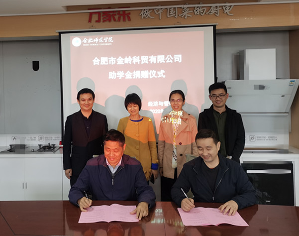 11月3日下午,在合肥金岭科贸有限公司,合肥师范学院经管学院与合肥金岭科贸有限公司举行了“金岭科贸助学金捐赠仪式”。金岭科贸有限公司总经理姜勇,副总经理、经管学院2008届校友史月娥,经管学院党委书记沈辉,发展规划处(校友办)副处长、校友会秘书长樊彩萍,经管学院教师李志东、辅导员谷跃东出席了捐赠仪式。