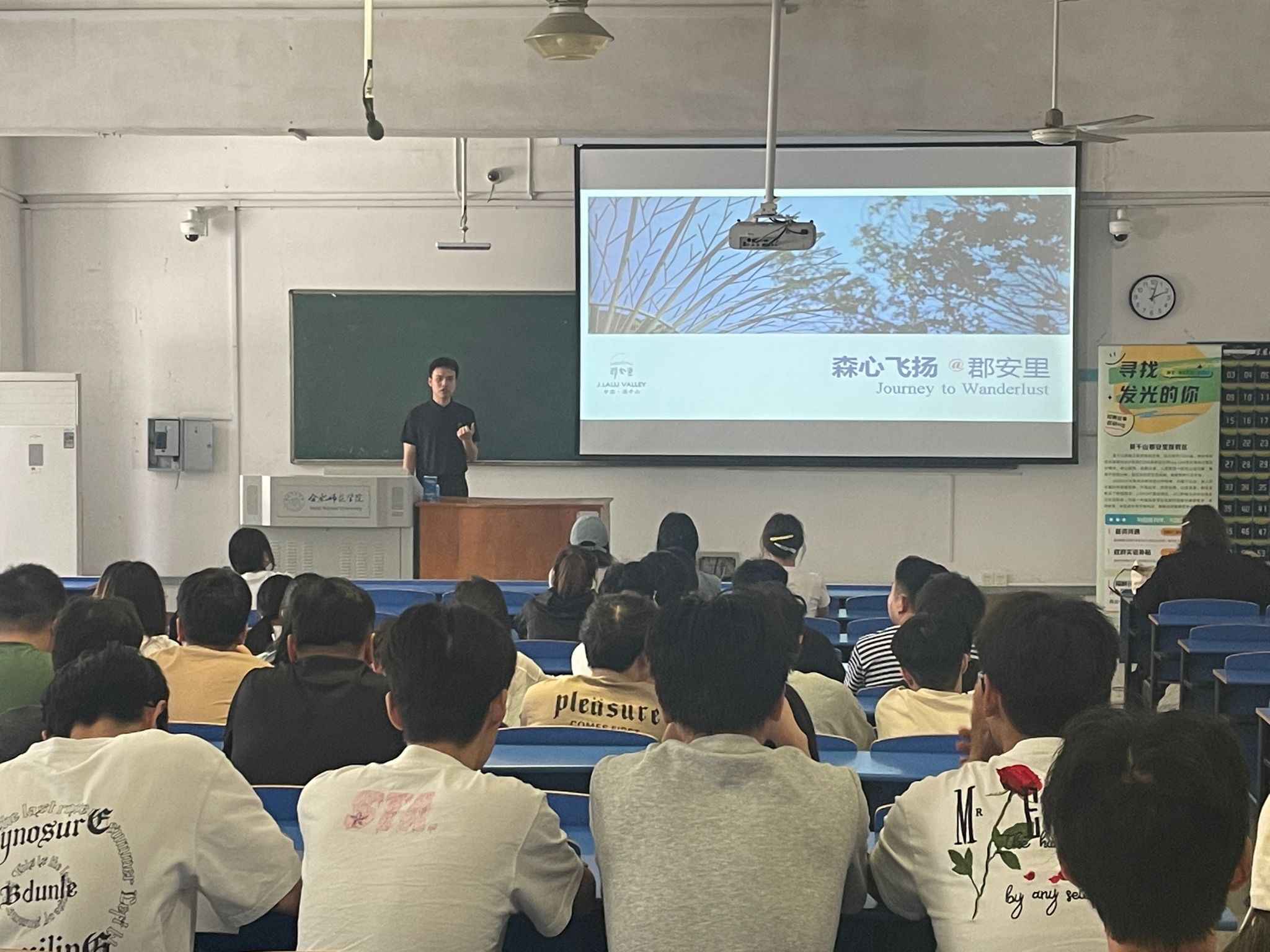 宣讲会上,浙江郡安里文旅发展有限公司人力资源部经理常星海通过视频、图文等形式,全面介绍了公司的发展理念与特色,并强调“实践与成长并重”的培养模式,包括专业培训、商业保险、免费食宿等福利保障。