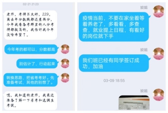 关心关爱,做好重点群体帮扶。辅导员线上与毕业生谈心谈话,心理辅导,安抚学生畏难情绪,帮助考研失利的同学及时转变角色,对于慢就业和就业困难的学生,加强督促指导,提供支持和帮助。