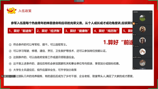本网讯 征兵工作启动以来,pp电子游戏平台网站党委高度重视,将征兵工作作为一项重要的政治任务,召开征兵工作专题会议,切实增强征兵工作的使命感。为进一步强化征兵工作的实效性,扎实做好2023年征兵宣传工作,帮助学生了解应征入伍相关政策,不断激发毕业生参军入伍的热情,营造“报名热、入伍热、成才热”的浓厚氛围,学院于4月25日上午开展2023年毕业生入伍宣传线上主题班会。