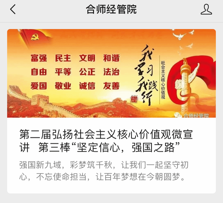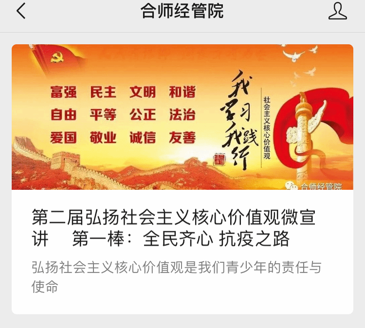 为团结引领广大团员青年弘扬和践行社会主义核心价值观,积极投身同心共筑伟大复兴中国梦的奋斗征程,近日,pp电子游戏平台网站分团委在微信公众号“合师经管院”开展了弘扬社会主义核心价值观微频“云”接力宣讲活动。