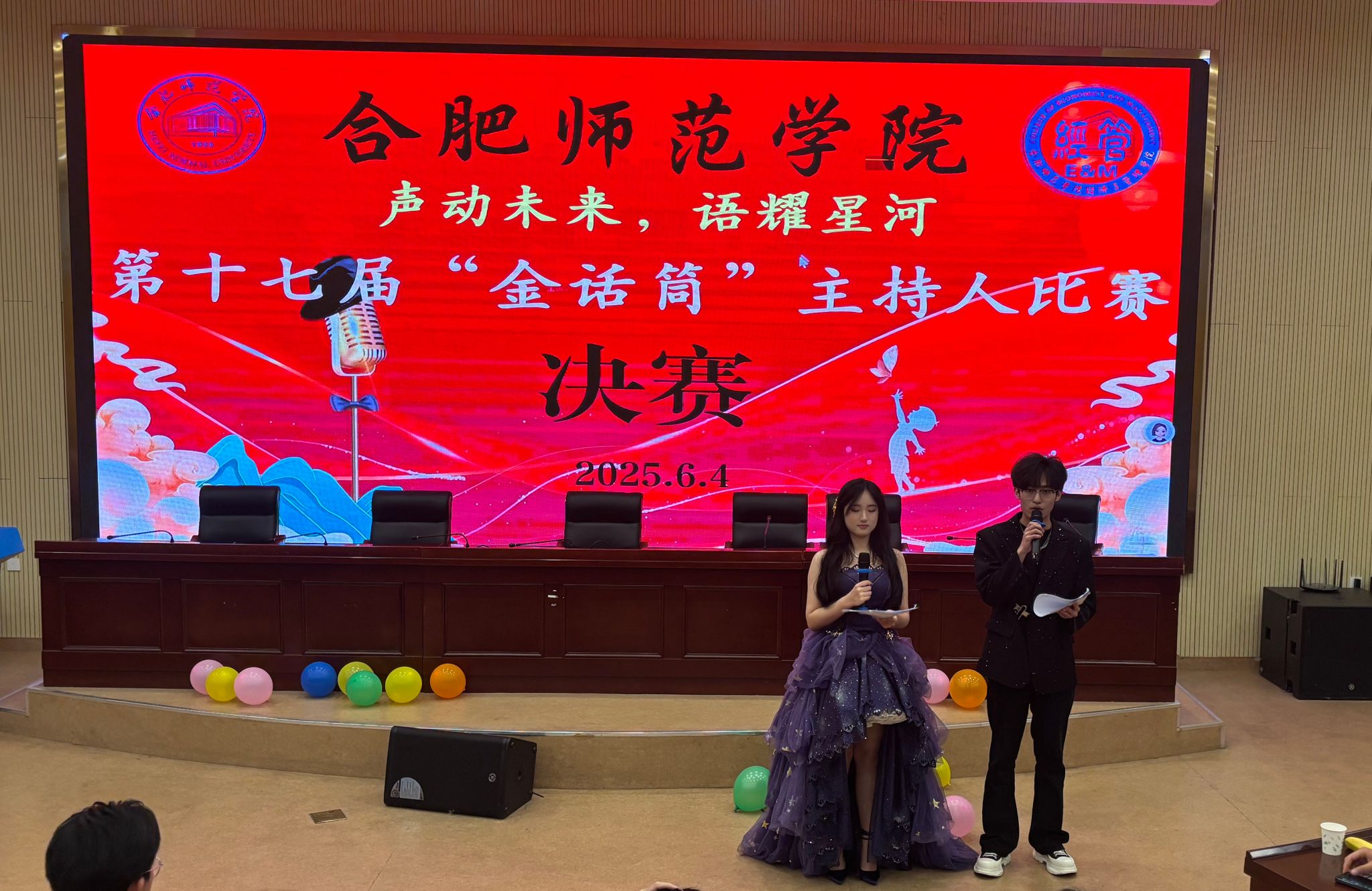 6月4日晚,滨湖校区学术报告厅内灯火辉煌,气氛热烈,由pp电子游戏平台网站承办的合肥师范学院第十七届“金话筒”主持人大赛决赛在此圆满落下帷幕。经过激烈角逐的初赛,这场由经管学院主办的决赛为师生们带来了一场别开生面的语言艺术盛宴,在合师校园文化天空中闪耀着独特的光芒。
